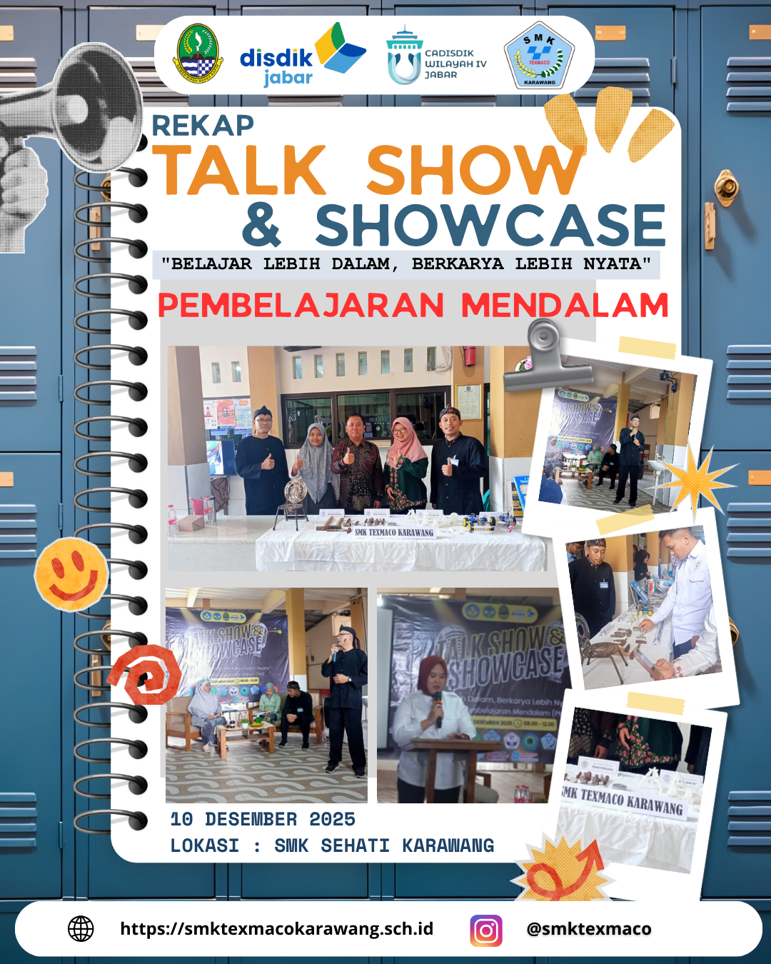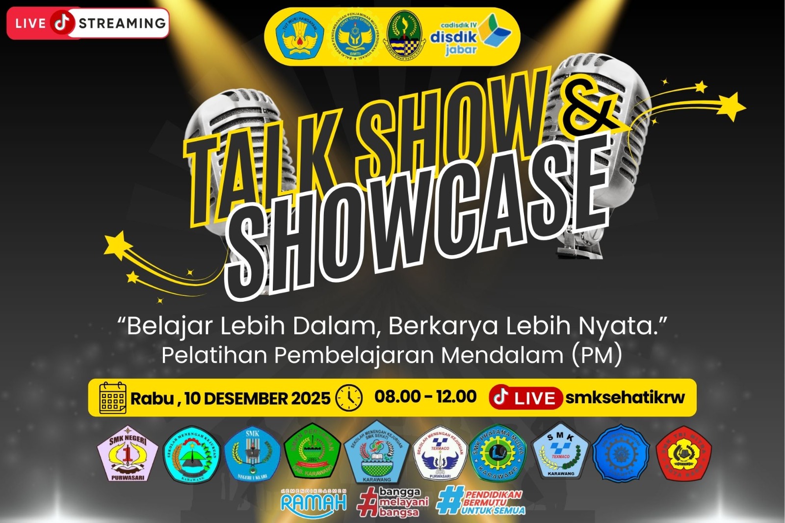 Pelatihan Pembelajaran Mendalam (Deep Learning) akhirnya mencapai puncak acara kegiatan yakni kegiatan Talk show dan show case dengan tema "Belajar lebih dalam, berkarya lebih nyata" yang dilaksanakan di SMK Sehati Karawang pada hari Rabu, 10 Desember 2025 masing-masing sekolah menunjukan dampak pelatihan yang sudah di laksanakan.