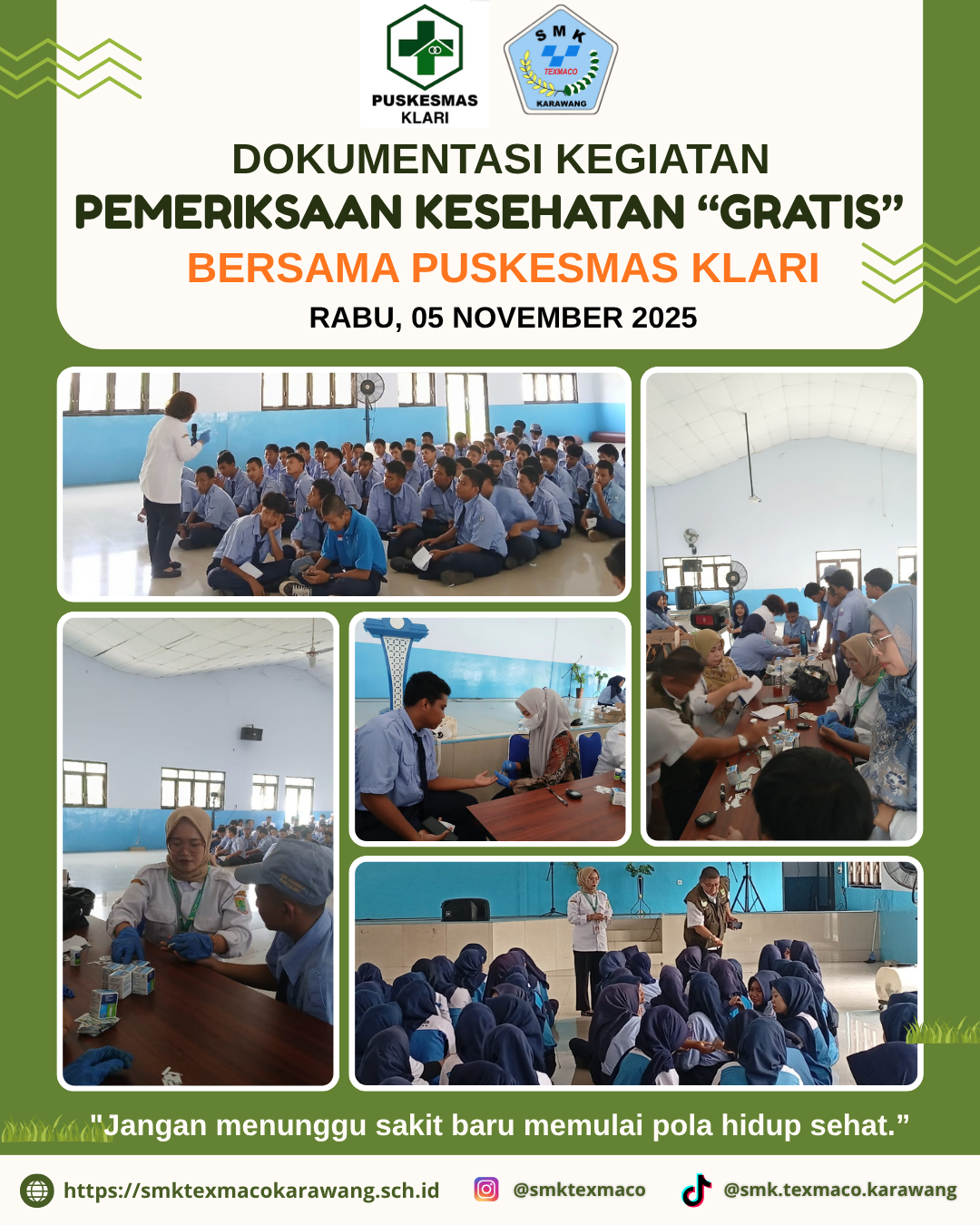 Rabu, 05 November 2025 SMK Texmaco Karawang kedatangan team dari Puskesmas Klari dalam rangka “Pemeriksaan Kesehatan Gratis”. kegiatan bersama puskesmas klari adalah program yang sangat baik, ini dapat membantu siswa memahami kondisi kesehatan mereka dan mendapatkan perawatan yang di perlukan.