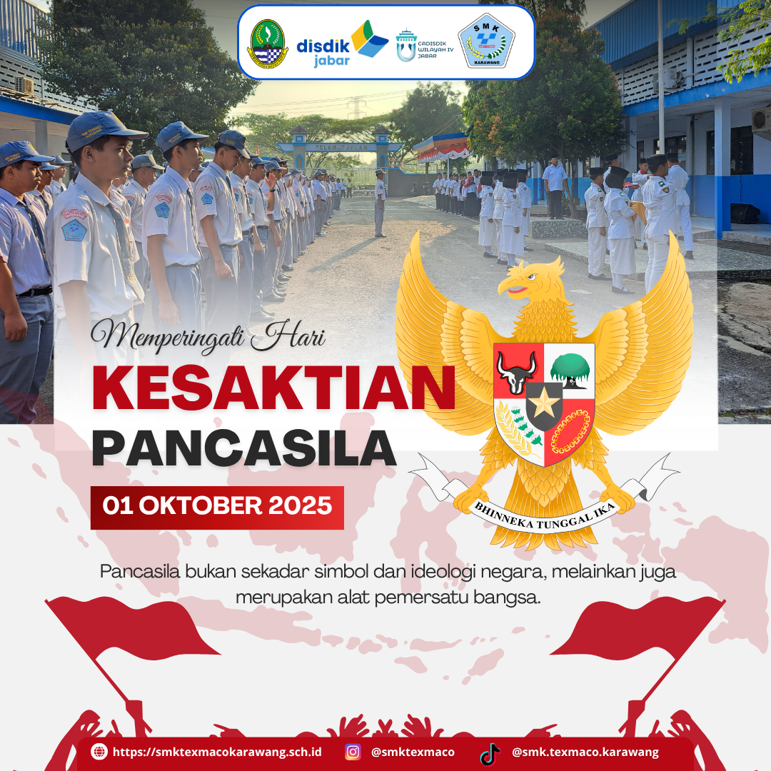 SMK Texmaco Karawang mengadakan upacara peringatan hari kesaktian pancasila pada Hari Rabu,1 Oktober 2025 di lapangan upacara SMK Texmaco Karawang tersebut dimulai pada pukul 07.00 WIB dan di hadiri oleh Bapak Ibu Guru, Staff Tata Usaha serta siswa siswi SMK Texmaco Karawang.