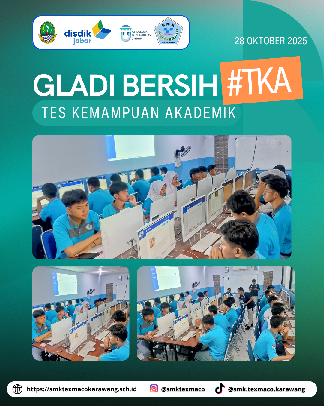 SMK Texmaco Karawang melaksanakan kegiatan Gladi Bersih Tes Kemampuan Akademik (TKA) pada hari selasa, tanggal 28 Oktober 2025. Kegiatan ini berlangsung di Laboratorium Komputer SMK Texmaco Karawang dan diikuti oleh peserta secara bergantian dalam tiga sesi setiap harinya.