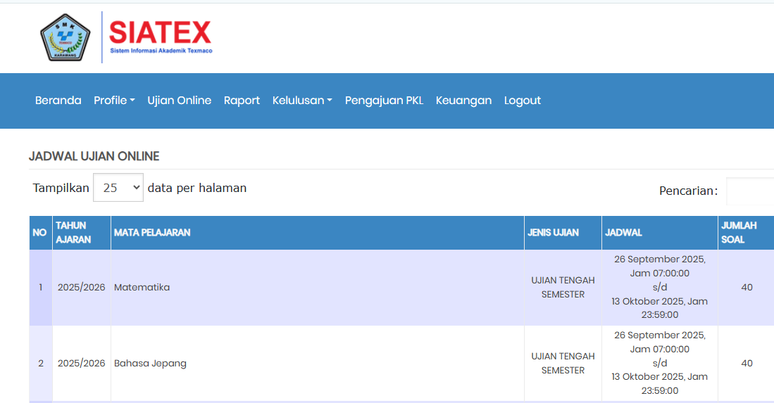 Sesuai dengan kalender Pendidikan SMK Texmaco Karawang bahwa pelaksanaan Penilaian Sumatif Tengah Semester (PSTS) Ganjil dilaksanakan pada tanggal 15 – 22 September 2025. Penilaian Sumatif Tengah Semester adalah kegiatan asesmen sumatif pada tengah semester awal.